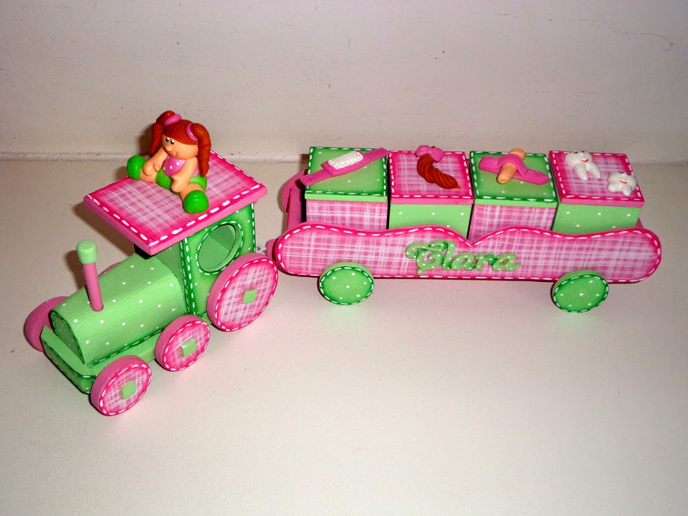 Comboio com quatro caixinhas para guardar as primeiras recordações da princesa Matilde, como o cabelo, pulseira, chucha e os dentinhos de leite. Espero que gostem ;)